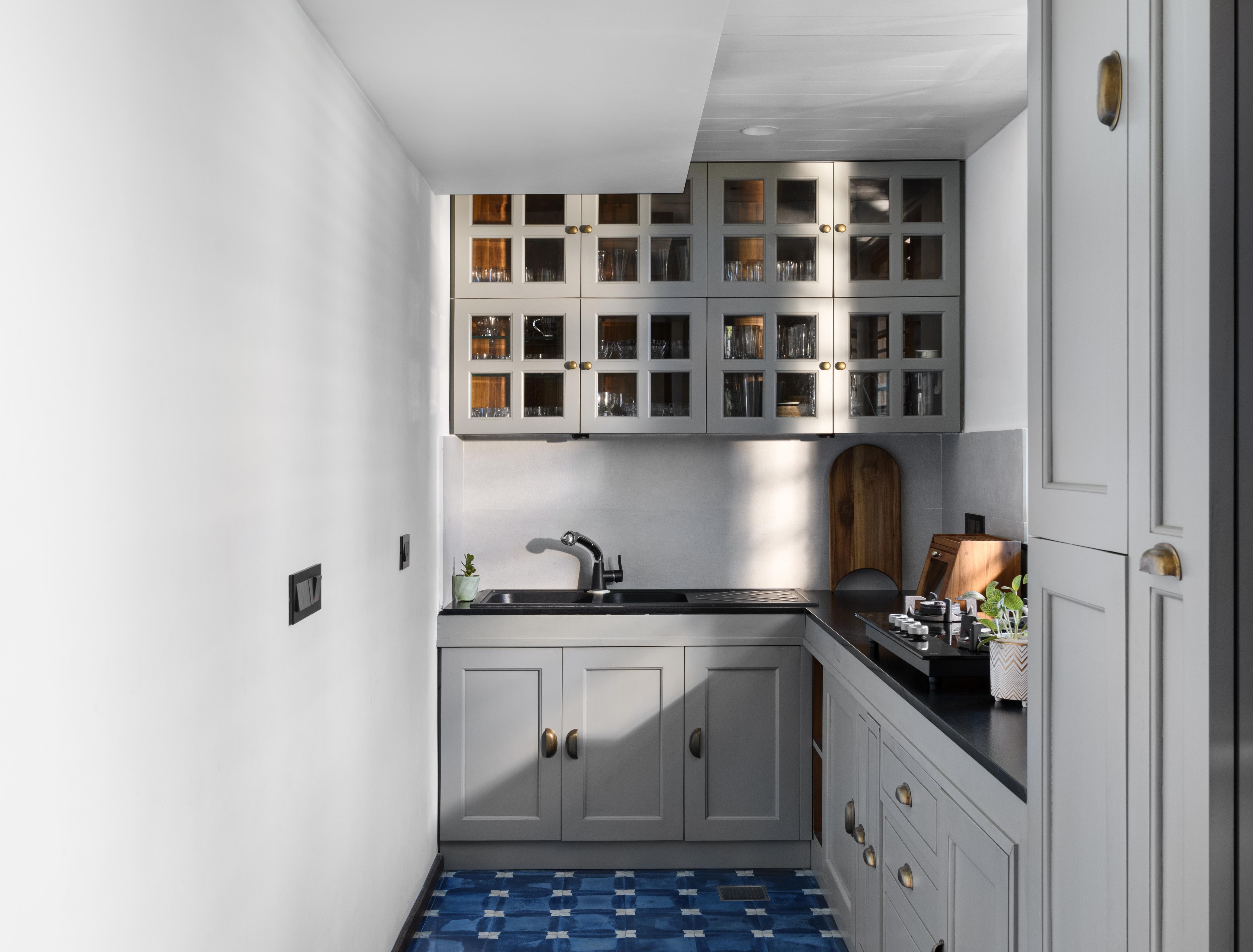Presenting our kitchen entailing the chemistry of a monochrome palette against all odds. Utilizing the most of a small work area to create a versatile kitchen, it generously spills a cool tone of soothing grey on its cabinetry all around. Opting for closed cabinets in teak with brass knobs that instantly add an element of interest, this kitchen is all set to radiate a sense of striking simplicity and character. Leathered stone in black takes a permanent spot on the countertop while a vibrant blue tiled floor immediately kicks in to break the monotony of the grey hue.