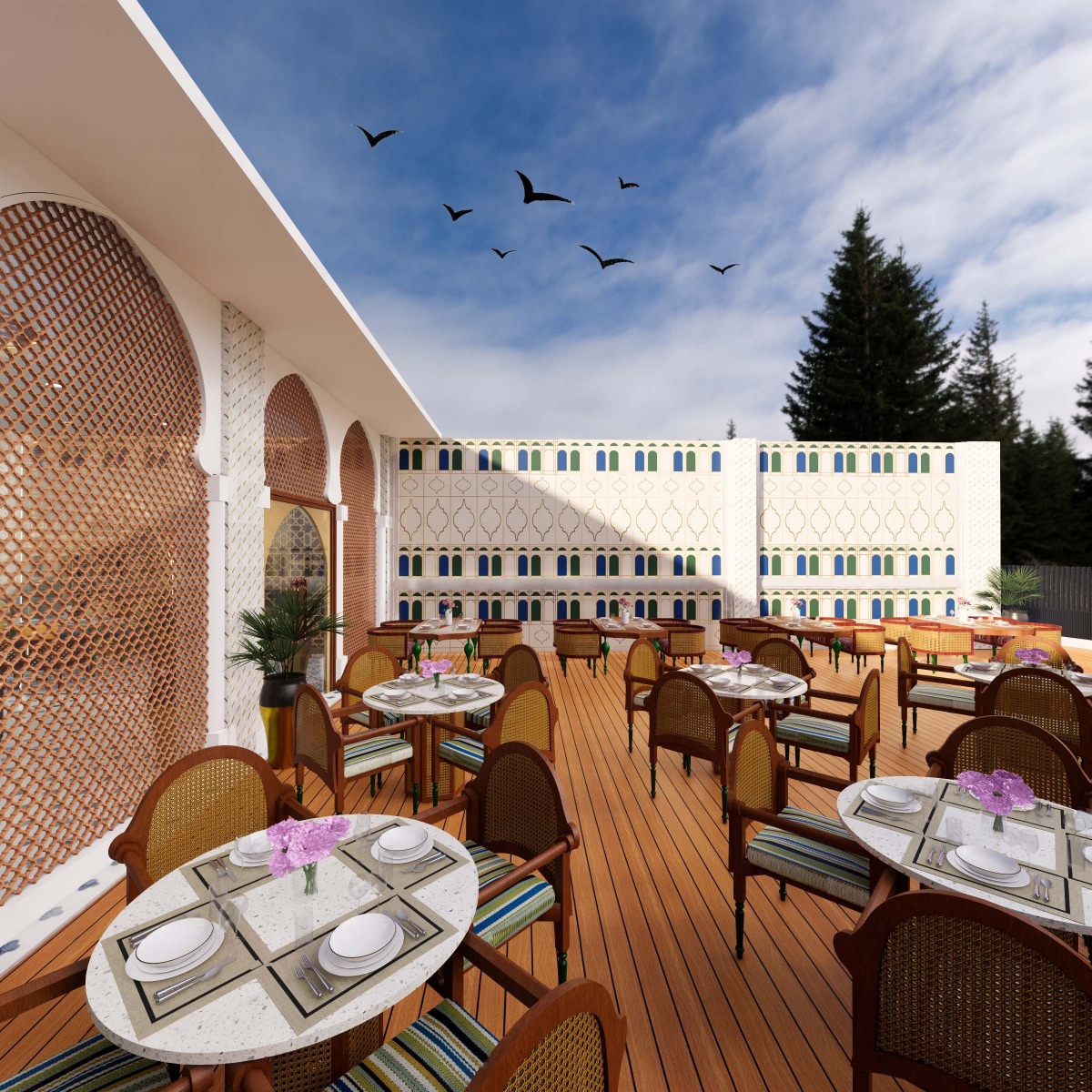 Bagian lain juga terlihat pada wall art all day dining yang memberikan kesan menyatu dengan alam, karena menggunakan warna hijau dan biru cerah yang mengindikasi kesan natural. Penerapan konsep Arab ini sangat cocok untuk all day dining restaurant yang cerah dan natural.